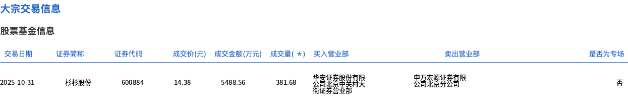 10月31日,杉杉股份大宗交易成交381.68万股,成交额5488.56万元,占当日总成交额的2.29%,成交价14.38元,较市场收盘价13.75元溢价4.58%。